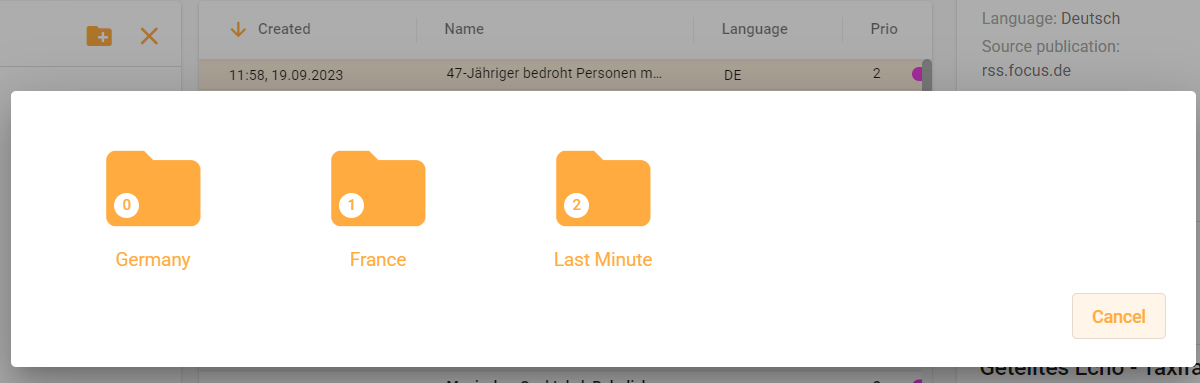 After you have created a folder, you can select one or several news items from the table and drag them to the desired folder or select them and press the f key and choose to which folder you want to assign the selected items, this makes the process faster when you want to put several items in one folder at the same time.