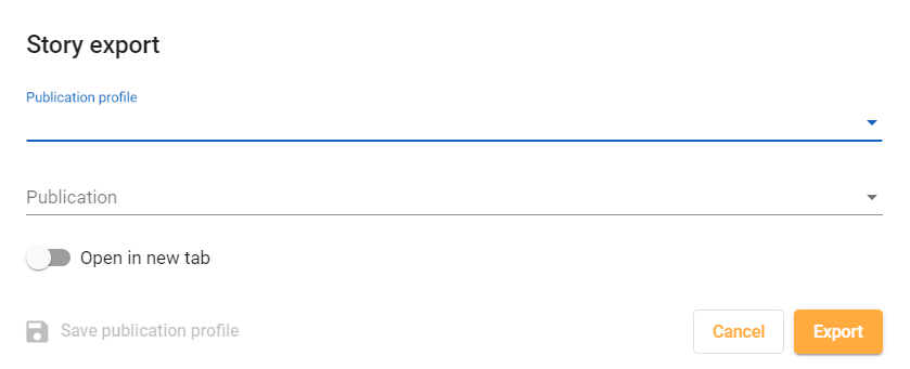 Publication profile: This is a profile with individual settings created by the user, i.e. only visible to the user, the profile is used to save time and instead of defining certain settings for each news item each time it is exported, a setting is saved in advance and can then be used to export more quickly.